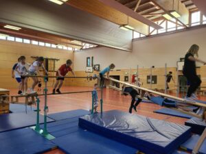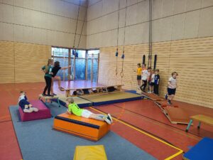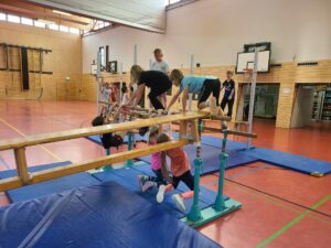 Auch in dieser Woche vor den Weihnachtsferien wurde die Turnhalle der Niederheide über Nacht von fleißigen Wichteln in einen großen Abendteuer-Kletterwald verwandelt. Man kann, wenn man sich anstrengt und konzentriert, durch zweidrittel der Halle klettern, ohne ein einziges Mal den Boden zu berühren. Am ersten Tag wurde diese Gelegenheit auch schon ausgiebig genutzt und die Schülerinnen und Schüler der Schule gaben ihr Bestes. Dabei kann natürlich jede und jeder das Tempo selber bestimmen. Ebenso die Art, wie die Hindernisse zu überwinden sind.