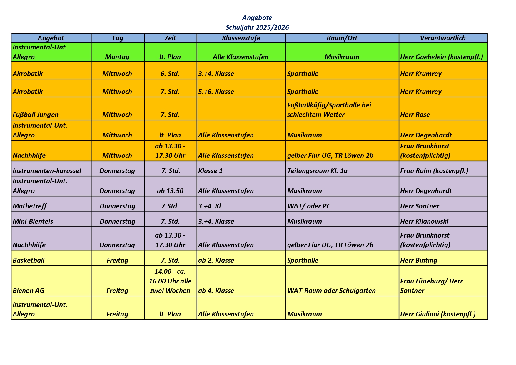 Schule besteht aus noch sehr viel mehr als nur die Wissensvermittlung im „normalen“ Unterricht. An der Grundschule Niederheide bieten die Kolleginnen und Kollegen daher Arbeitsgemeinschaften aus den verschiedensten Themenbereichen an und fördern und fordern damit unsere Schülerinnen und Schüler. Ob nun der Umgang mit Hunden, die Betreuung von Bienenvölkern und die Honiggewinnung, akrobatische und turnerische Elemente, die Steigerung der Spielfähigkeit im Basketball oder die Erarbeitung und Aufführung von Theaterstücken – hier findet jeder seine Herausforderung!